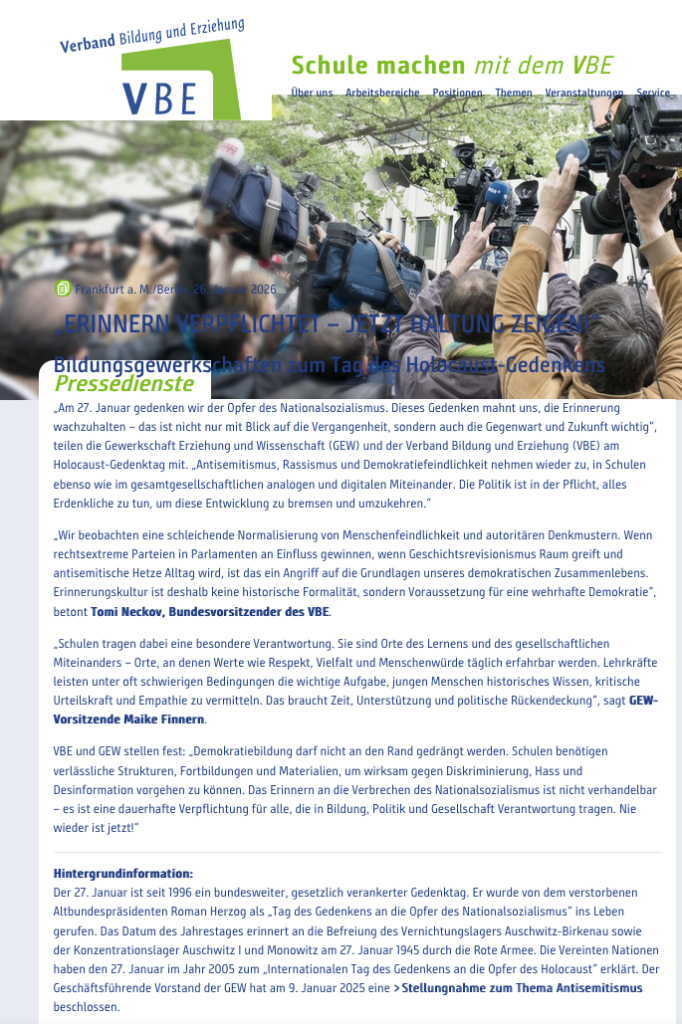 VBE und GEW stellen fest: „Demokratiebildung darf nicht an den Rand gedrängt werden. Schulen benötigen verlässliche Strukturen, Fortbildungen und Materialien, um wirksam gegen Diskriminierung, Hass und Desinformation vorgehen zu können. Das Erinnern an die Verbrechen des Nationalsozialismus ist nicht verhandelbar – es ist eine dauerhafte Verpflichtung für alle, die in Bildung, Politik und Gesellschaft Verantwortung tragen. Nie wieder ist jetzt!“